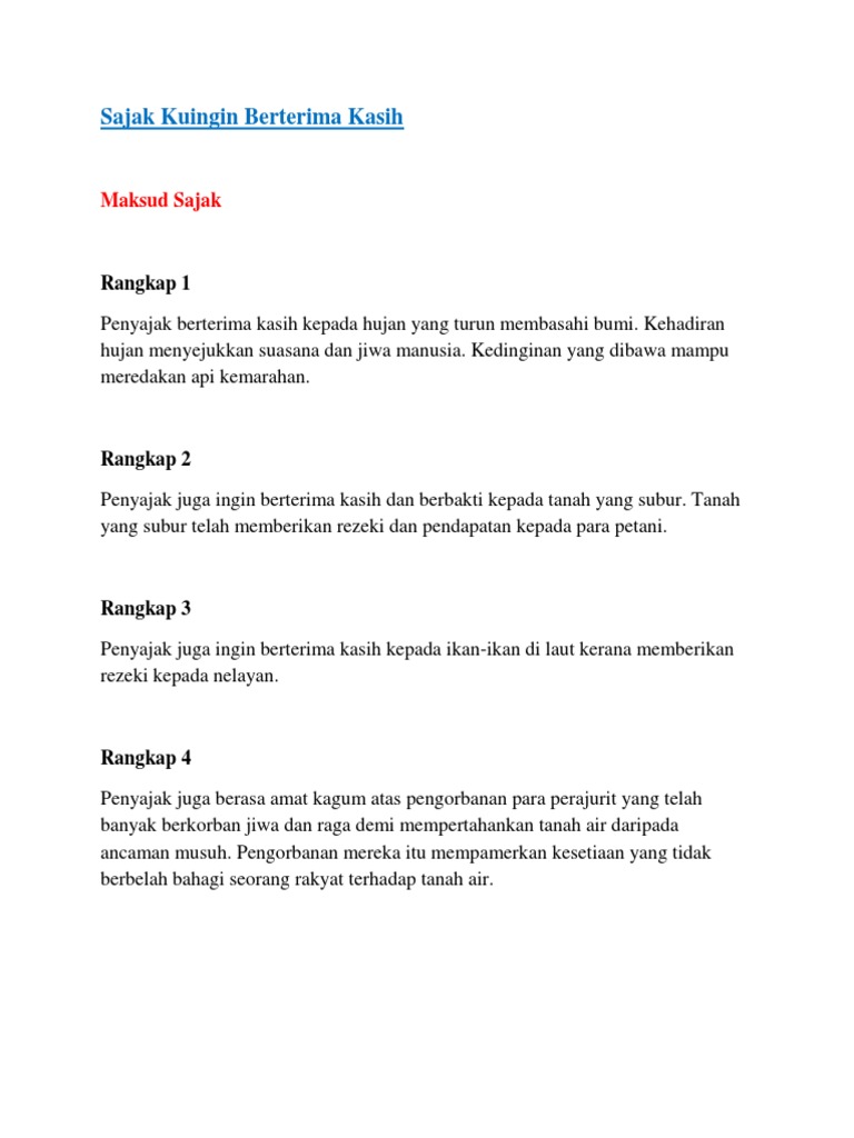 MAKSUD SAJAK Kuingin Berterima Kasih Rangkap Maksud 1 Penyajak berterima kasih kepada hujan yang turun membasahi bumi. Rangkap 2 Sesekali penyajak ingin berbudi kepada tanah kerana tanah memberikan hasil untuk para petani. Terdapat tiga hingga lima baris setiap rangkap.