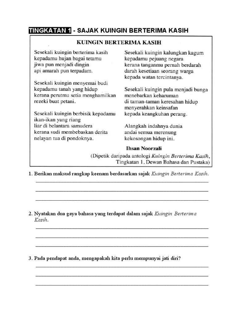 Posted by CIKGU TAN CL at 0918 1 comment. Antologi Kuingin Berterima Kasih ini akan digunakan mulai tahun 2015 hingga 2019. Maksud Sajak Tema Persoalan Bentuk Gaya Bahasa Unsur Bunyi Nilai Pengajaran Sajak Kuingin Berterima Kasih K Komsas BM Bahasa Melayu Tingkatan 1 PT3.